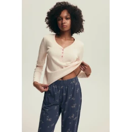 Bluzka z długim rękawem w kremowym odcieniu posiada dekolt w serek oraz elegancką listwę z różowymi guzikami, co dodaje jej kobiecego uroku. Długie spodnie w granatowym kolorze ozdobione są delikatnym nadrukiem roślinnym, a elastyczny pas zapewnia wygodne dopasowanie bez ucisku.