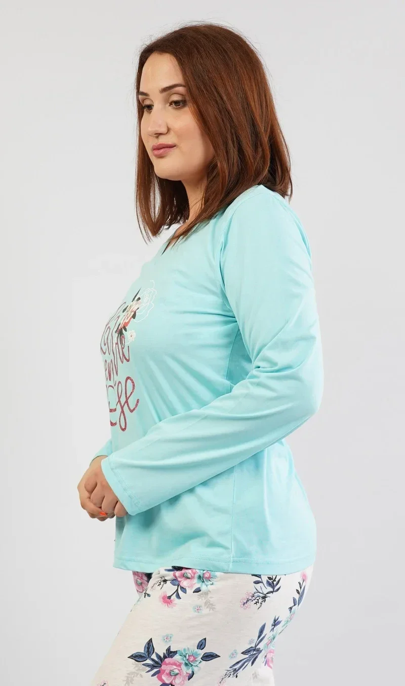 Dámske pyžamo s dlhým rukávom Rose. Pyžamo sa skladá z trička s dlhým rukávom a dlhých nohavíc. Jednofarebné tričko má zlatý nápis "La Vie en Rose" sprevádzaný obrázkom ruže. Motív ruže sa opakuje na dlhých nohaviciach, ktoré majú elastický pás a šnúrku na stiahnutie, ale nemajú vrecká. Použitý materiál je pružný a príjemný na dotyk. Tričko sa skladá zo 100 % bavlny, nohavice majú 100 % podiel bavlny.