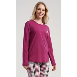 Dámské bavlněné dlouhé pyžamo Andrea. Dámské pyžamo se skládá z trika s dlouhým rukávem a dlouhých kalhot. Jednobarevné triko s kulatým výstřihem zdobí na hrudi drobný nápis a hvězdy. Kárované kalhoty mají v pase gumu a šňůrku na stažení, nemají kapsy. Použitý bavlněný materiál je poddajný a příjemný na dotek.