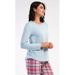 Dámské bavlněné dlouhé pyžamo Dominica. Dámské pyžamo se skládá z trika s dlouhým rukávem a dlouhých kalhot. Triko je jednobarevné, bez potisku, má kulatý výstřih. Kárované kalhoty mají v pase gumu a šňůrku na stažení, nemají kapsy. Použitý bavlněný materiál je poddajný a příjemný na dotek.