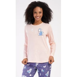 Dámské bavlněné dlouhé pyžamo Good night. Dámské pyžamo se skládá z trika s dlouhým rukávem a dlouhých kalhot. Triko je jednobarevné, zdobené obrázkem medvídka s polštářem. Obrázky medvídků se opakují i na kalhotách, které mají v pase gumu a šňůrku na stažení, nemají kapsy. Použitý bavlněný materiál je poddajný a příjemný na dotek.