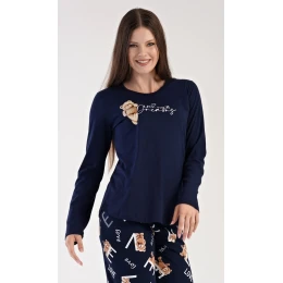 Dámske bavlnené pyžamo dlhé Méďa. Dámske pyžamo sa skladá z trička s dlhým rukávom a dlhých nohavíc, ktoré sú zakončené patentmi. Tričko je jednofarebné, zdobené obrázkom plyšového medveďa a nápisom LIVE YOUR DREAMS. Nohavice sú tmavo modré, potlačené rovnakým motívom, majú v páse gumu a šnúrku na stiahnutie. Použitý materiál je poddajný a príjemný na dotyk. Nohavice aj tričko je zložené zo 100% bavlnou.