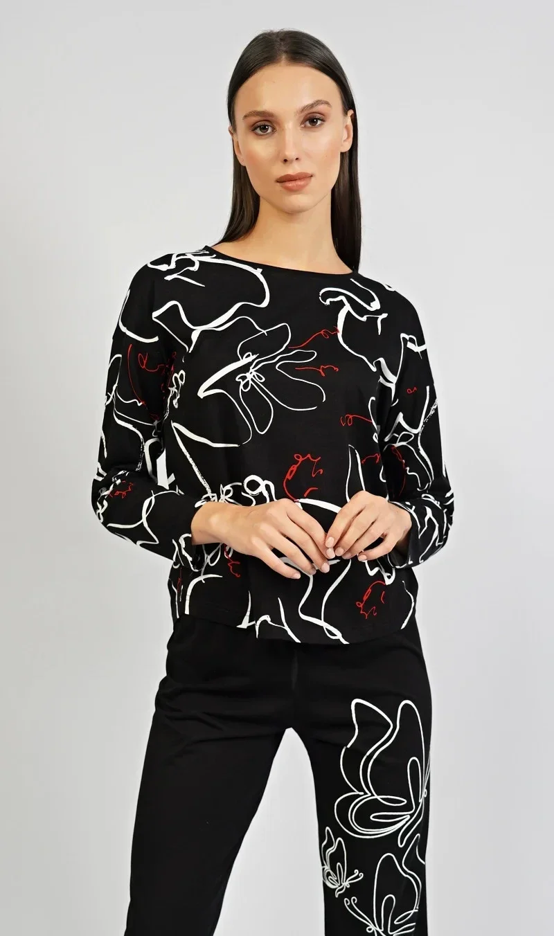Dámské pyžamo dlouhé Lucie. Dámské pyžamo se skládá z trička s dlouhým rukávem a dlouhých kalhot. Triko je černé s bílým nepravidelným vzorem. Kalhoty jsou jednobarevné s kresbou tří motýlů., jsou do gumy, na stažení šňůrkou a bez kapes. Použitý materiál je poddajný a příjemný na dotek.