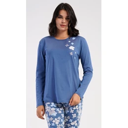 Dámské bavlněné dlouhé pyžamo Joanne. Dámské pyžamo se skládá z trika s dlouhým rukávem a dlouhých kalhot. Jednobarevné triko s kulatým výstřihem je ozdobeno obrázkem květů. Tento motiv se opakuje i na kalhotách, které mají v pase gumu a šňůrku na stažení, nemají kapsy. Použitý bavlněný materiál je poddajný a příjemný na dotek.