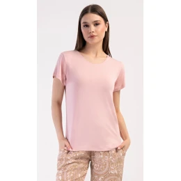 Dámske pyžamo s krátkymi rukávmi Olga. Pyžamo sa skladá z trička s krátkymi rukávmi a dlhých nohavíc. Tričko je jednofarebné, bez potlače a má okrúhly výstrih. Nohavice s potlačou s orientálnymi vzormi majú elastický pás a šnúrku na stiahnutie a nemajú vrecká. Použitý viskózový materiál je pružný a príjemný na dotyk.