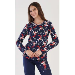 Dámske bavlnené pyžamo dlhé Sob. Dámske pyžamo sa skladá z trička s dlhým rukávom a dlhých nohavíc. Tričko je ozdobené nápisom obrázkami sobov s vianočnou čiapočkou a nápismi JOY. Rovnaký motív sa opakuje aj na nohaviciach. Nohavice majú v páse gumu, šnúrku na stiahnutie a sú zakončené lemy. Použitý materiál je poddajný a jemný na dotyk. Nohavice aj tričko je zložené zo 100% bavlnou.