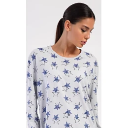 Dámské bavlněné dlouhé pyžamo Stars. Dámské pyžamo se skládá z trika s dlouhým rukávem a dlouhých kalhot. Triko je jednobarevné, potištěné hvězdami. Tento motiv se opakuje i na kalhotách, které mají v pase gumu a šňůrku na stažení, nemají kapsy. Použitý bavlněný materiál je poddajný a příjemný na dotek.