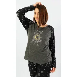 Dámske dlhé pyžamo The Moon. Pyžamo pozostáva z dlhých nohavíc a trička s dlhým rukávom. Pyžamo je potlačené astrologickými a astronomickými motívmi, ktorým dominuje veľký mesiac. Pyžamové nohavice majú elastický pás a šnúrku na stiahnutie a nemajú vrecká. Použitý materiál je pružný a príjemný na dotyk. Tričko a nohavice sa skladajú zo 70 % bavlny.