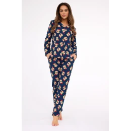 Rozkošné dámske pyžamo DR 482/459 Teddy 5 z vianočnej kolekcie je ideálnou voľbou na zimné večery a sviatočné obdobie. Je vyrobené zo 100 % kvalitnej, mäkkej bavlny, poskytuje teplo, pohodlie a úplnú voľnosť pohybu. Vrchný diel pyžama je klasický top s dlhými rukávmi, zapínaním na gombíky, elegantným golierom a sviatočnou potlačou, ktorá vás naladí na čarovnú vianočnú atmosféru. Súpravu dopĺňajú dlhé nohavice s elastickým pásom podšité bavlnou pre pohodlie a dokonalé prispôsobenie. Je to ideálna súprava na spanie alebo večer doma - tiež skvelý nápad na darček.