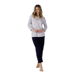 Dámske pyžamo so 7/8 dĺžky rukávov, vzorované, s výstrihom. 7/8 dĺžky jednofarebných nohavíc na doplnenie súpravy.
