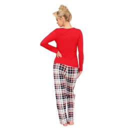 Dámské pyžamo Ho Ho long red Donna - z vysoce jakostní bavlny - červené tričko s dlouhými rukávy - půlkulatý výstřih - ozdobené potiskem na přední straně - dlouhé kárované kalhoty - v pase ozdobná červená saténová mašlička