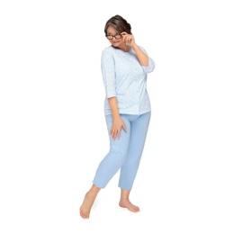 Piżama damska KASIA II 266 to komfortowy komplet stworzony z myślą o kobietach ceniących praktyczne rozwiązania i naturalne materiały. Uszyta z 100% bawełny, jest miękka, przewiewna i przyjazna dla skóry. Bluzka z rękawem 3/4, okrągłym dekoltem i dwiema kieszeniami jest w pełni rozpinana, co sprawia, że świetnie sprawdza się również dla mam karmiących. Spodnie o długości 7/8 z elastyczną gumką w pasie zapewniają wygodne dopasowanie. Polski producent gwarantuje wysoką jakość wykonania.