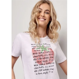 Dámské pyžamo italské značky Infiore. Dvoudílné pyžamo se skládá z trička a kalhot, celé pyžamo je vyrobeno z bavlny, je pružné a volnější. Tričko klasického střihu je úplně hladké, má krátký rukáv, kulatý výstřih a potisk na přední straně. Dlouhé kalhoty v třičtvrťové délce jsou jednoduché, hladké, bez kapes. V pase je pružná guma obšita látkou.