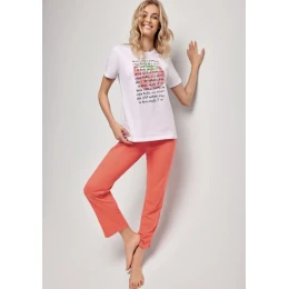 Dvojdielne pyžamo sa skladá z trička a nohavíc, celé pyžamo je vyrobené z bavlny, je elastické a voľné. Tričko klasického strihu je úplne hladké, má krátke rukávy, okrúhly výstrih a potlač na prednej strane. Trojštvrťové dlhé nohavice sú jednoduché, hladké, bez vreciek. Materiálové zloženie: 100 % bavlna.