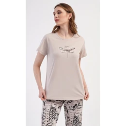 Dámské bavlněné kapri pyžamo Elena. Dámské pyžamo se skládá z trička s krátkým rukávem a tříčtvrtečních kalhot. Tričko s kulatým výstřihem zdobí na hrudi obrázek vážky. Kalhoty s potiskem listů a květů mají v pase gumu a šňůrku na stažení, jsou bez kapes. Použitý bavlněný materiál je příjemný a poddajný na dotek.