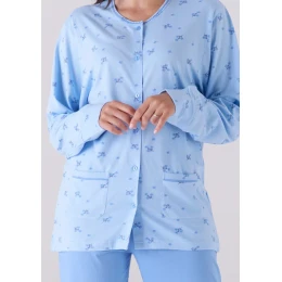 Dámské pyžamo italské značky Karelpiu. Pyžamo se skládá z trička a kalhot. Horní díl má dlouhý rukáv, kulatý výstřih a přes celkou délku légu s knoflíky. Ve spodní části jsou po stranách našity kapsy. Tričko je jednobarevné s jemným květinovým potiskem. Rukávy jsou ukončeny širokou manžetou. Kalhoty jsou dlouhé, jednoduché, jednobarevné. V pase je obšitá pohodlná pružná guma. Pyžamo je ušité z lehké příjemné bavlny. Je dostupné ve dvou barevných variantách.