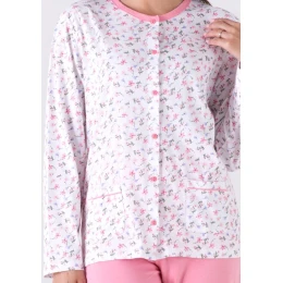 Dámské pyžamo italské značky Karelpiu. Pyžamo se skládá z trička a kalhot. Tričko má dlouhý rukáv, kulatý výstřih s légou a knoflíky po celé délce - dá se rozepnout. Tričko je s květinovým celopotiskem. Ve spodní části na bocích jsou našity kapsičky. Kalhoty jsou dlouhé, jednobarevné, bez kapes. V pase je obšitá pohodlná pružná guma. Pyžamo je ušito z lehké příjemné bavlny. Pyžamo je dostupné ve dvou barevných variantách.