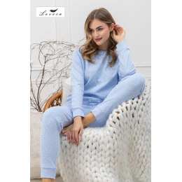 Dámske pyžamo Klarysa 1658 značky Leveza je dokonalou kombináciou pohodlia a moderného štýlu. Je vyrobené zo 100 % bavlny so zvýšenou gramážou (180 g/m²), je výnimočne mäkké, odolné a príjemné na nosenie aj počas chladnejších dní. Vrchný diel s okrúhlym výstrihom a dlhými rukávmi s rebrovanými manžetami obopína telo a poskytuje teplo. Nohavice s dlhými nohavicami, tiež s rebrovanými manžetami, majú praktické vrecká a ozdobnú šnúrku, ktorá im dodáva šarm. Celok je zachovaný v elegantnom odtieni atramentovej modrej s jemným, nepravidelným hráškovým vzorom - decentným a ženským zároveň.