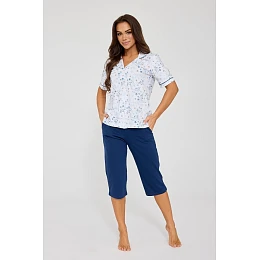 Vrchnú časť súpravy tvorí tričko s krátkym rukávom, ktoré zdobí jemná farebná kvetinová potlač. Model s golierom a zapínaním na gombíky dodáva pyžamu elegantný, nadčasový charakter a zároveň zaručuje pohodlie počas používania.