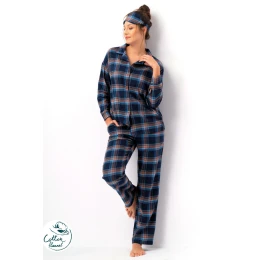 Toto dámske pyžamo z mäkkého bavlneného flanelu je ideálnou voľbou na zimné večery a rána. Vzor v elegantnom námorníckom a hnedom károvanom prevedení pôsobí klasicky a nadčasovo. Vrchná časť košele so zapínaním na gombíky má golier a náprsné vrecko, čím sa spája pohodlie s estetikou. Rovne strihané nohavice s elastickým pásom zabezpečujú voľnosť pohybu a pohodlie počas spánku. Súprava sa dodáva s vhodnou prikrývkou, takže si môžete vychutnať pokojný a nerušený spánok. Je to súprava, ktorá spája praktickosť, teplo a ženský štýl.