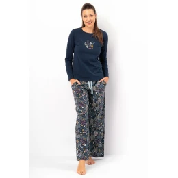 Dámska pyžamová súprava LNS 571 B25 je pohodlná a štýlová súprava, ktorá spája prírodné materiály s módnym dizajnom. Je vyrobená z úpletu príjemného na dotyk (95 % bavlna, 5 % elastan) a poskytuje pohodlie a voľnosť pohybu. Tričko s dlhými rukávmi, polkruhovým výstrihom a farebnou kvetinovou potlačou na prednej strane dodáva súprave svieži a ženský nádych. Dlhé, voľné a rozšírené nohavice majú vzorovaný dizajn a praktické vrecká na bokoch pre väčšiu funkčnosť. Elastický pás so šnúrkou na stiahnutie umožňuje dokonalé prispôsobenie. Ide o dokonalé pyžamo pre ženy, ktoré ocenia ležérny strih a štýlový vzhľad aj na doma.