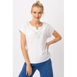 Dámska pyžamová súprava KEY LNS 623 spája pohodlie a šarm v každodennom vzhľade. Vrchnú časť súpravy tvorí voľné biele tričko s krátkymi rukávmi s jemnou, kvetinovou potlačou okolo výstrihu, ktorá dodáva jemnosť a ženskosť. Blúzka má praktický rozparok pri krku, ktorý dodáva štýl a zaručuje voľnosť pri nosení. Súpravu dopĺňajú tmavomodré nohavice s jemným, bielym bodkovaným vzorom - klasické, ale zároveň očarujúce. Celá súprava je vyrobená z mäkkej, priedušnej bavlny, takže pyžamová súprava je ideálna na leto aj zimu. Ideálna na pohodové večery doma alebo pokojný spánok.