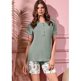 Dámske pyžamo Lormar v jemnom zelenom odtieni pôsobí sviežo a elegantne. Vrchný diel je tričko s krátkymi rukávmi, zapínaním na gombíky vo výstrihu a jemnou čipkou na rukávoch, čo modelu dodáva ženský a sofistikovaný vzhľad. Spodný diel tvoria pohodlné šortky vo svetlej farbe s jemnou prírodnou potlačou, ktoré krásne ladia s vrchným dielom. Materiál je ľahký, mäkký a príjemný na dotyk, ideálny na pokojný spánok a pohodlné domáce nosenie.