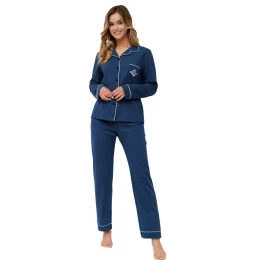 Pohodlné a elegantné dámske pyžamo z kvalitnej bavlny, s otvoreným golierom, zdobené vreckom a dlhými nohavicami so saténovými lemami.