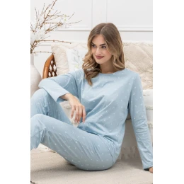 Dámske pyžamo MARTA 1646 značky LEVEZA je kombináciou pohodlia, kvality a jedinečného dizajnu. Je vyrobené zo 100 % mäkkej, priedušnej bavlny a zaručuje pohodlie počas celej noci. Blúzka s okrúhlym výstrihom, dlhými rukávmi a jemným vzorom nepravidelných mesiačikovóv azúrovej farbe dodáva originálny nádych. Nohavice s dlhou nohavicou, praktickými vreckami a ozdobnou šnúrkou v páse zaručujú úplnú voľnosť pohybu.