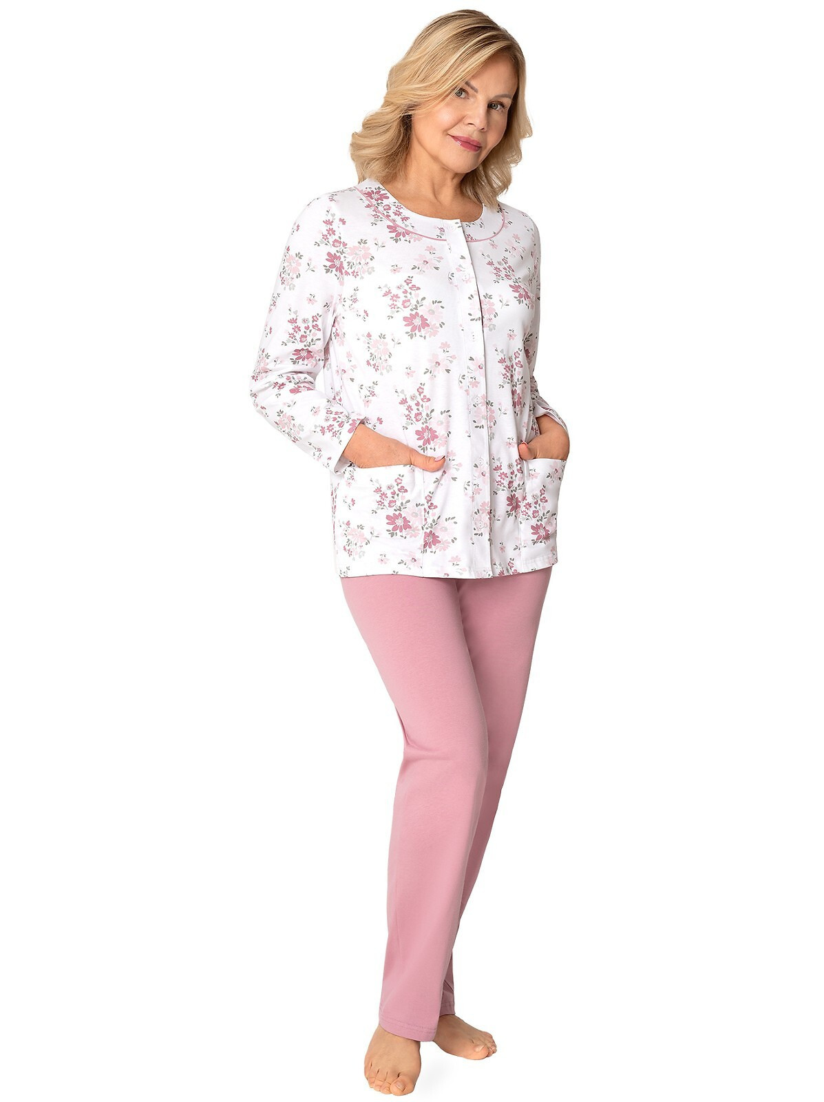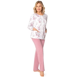 Vzorovaná blúza pyžamá má dlhé rukávy, okrúhly výstrih a rozopína sa. Jednofarebné nohavice s dlhými nohavicami majú v páse gumu.