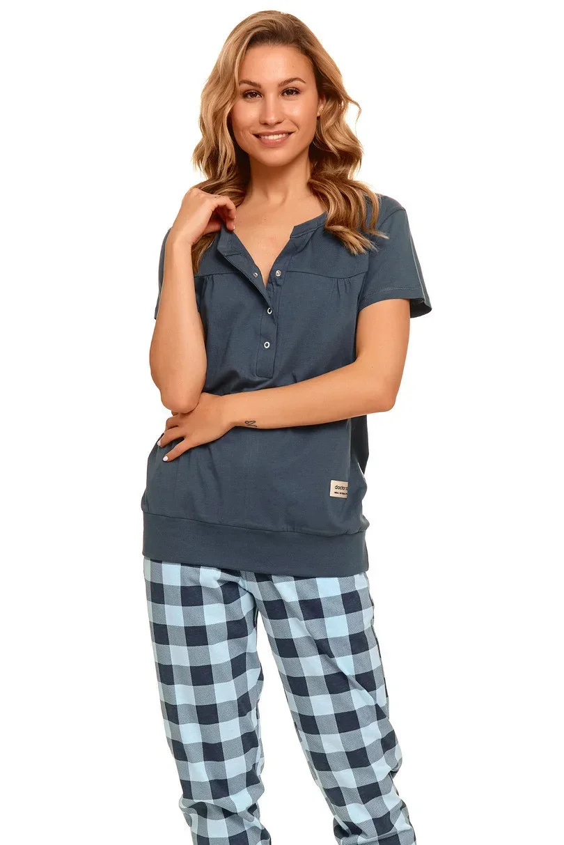 Blůza pyžama má krátké rukávy a její přední díl se zapíná patentkami. Komplet doplňují dlouhé vzorované kalhoty s kapsami.