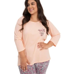 Dámské pyžamo 3010 Melissa TARO - vyrobené z vysoce kvalitní a měkké bavlny - tričko je růžové barvy s tříčtvrtečními rukávy - přední strana ozdobená potiskem - vzorované kalhoty