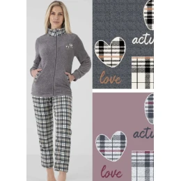 Dámské pyžamo od italské značky Karelpiu. Měkké, jemné a hřejivé pyžámko je z velmi příjemného materiálu. Vrchní díl má stojáček a zapínání na zip. Rukávy jsou ukončeny jemným úpletem. Kalhoty mají v pase všitou pohodlnou gumu.