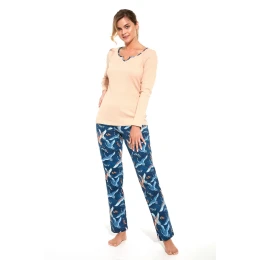 Dámské pyžamo 739/318 Veronica CORNETTE - bavlněný materiál je poddajný a jemný na dotek - béžové tričko s dlouhými rukávy - výstřih ozdobený lemováním - dlouhé vzorované kalhoty