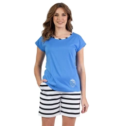 Dámské pyžamo 697 blue REGINA - z vysoce jakostní bavlny - světle modré tričko s krátkými rukávy - kulatý výstřih s pruhovaným lemováním - zdobené potiskem na přední straně - pruhované šortky