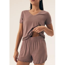 Dámské pyžamo od značky Henderson je skvělou volbou pro pohodlný spánek i domácí lenošení. Pyžamo se skládá z trička s krátkým rukávem a výstřihem do V a šortek, které jsou v pase na širokou pružnou gumu pro maximální komfort. Spodní lem trička i nohaviček šortek je ozdoben jemným vlnkovaným zakončením, které dodává celému kompletu ženský a elegantní vzhled. Díky příjemnému materiálu je pyžamo měkké a pohodlné na nošení.