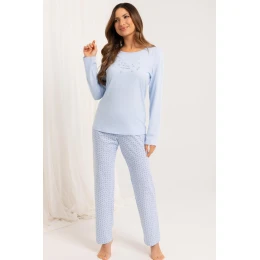 Piżama damska 708 BIG J/25 to doskonały wybór dla kobiet ceniących wygodę i subtelny styl. Zestaw został uszyty z wysokiej jakości, 100% bawełny, która jest miękka, przewiewna i przyjazna dla skóry. Góra kompletu to klasyczna koszulka z długim rękawem, półokrągłym dekoltem i nadrukiem na przodzie. Całość uzupełniają wzorzyste, długie spodnie o luźnym kroju, które zapewniają swobodę ruchów i komfort przez całą noc.