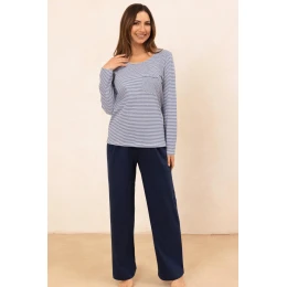 Piżama damska 715 J/25 to klasyczny zestaw nocny wykonany z wysokiej jakości, 100% bawełny. Koszulka w ponadczasowe paski z długim rękawem i okrągłym dekoltem zapewnia komfort i swobodę noszenia. Dodatkowa kieszonka na wysokości piersi dodaje jej uroku i funkcjonalności. Do kompletu dołączone są długie, jednolite spodnie z elastyczną gumką w pasie obszytą bawełną, co gwarantuje wygodne dopasowanie bez ucisku. Naturalny materiał sprawia, że zestaw idealnie nadaje się do spania i wieczornego relaksu w domu.