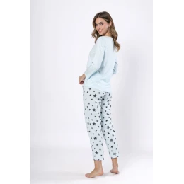 Piżama KAMILA 1642 marki Leveza to doskonałe połączenie wygody i subtelnej kobiecości. Wykonana w 100% z naturalnej bawełny, zapewnia miękkość, przewiewność i komfort przez całą noc. Górna część to bluzka z okrągłym dekoltem, rękawem 7/8 oraz uroczym nadrukiem łabędzi na tle koloru baby blue. Spodnie o długości 7/8 utrzymane są w tej samej tonacji i ozdobione nieregularnym wzorem gwiazdek, z dodatkiem dekoracyjnej kokardki w pasie. Całość tworzy spójny, harmonijny zestaw idealny na każdą porę roku. Dostępna w rozmiarach od S do 2XL.