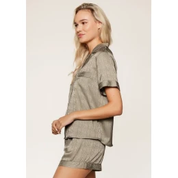 Dámská luxusní pyžamová sada složená z krátkých kalhot a halenky s krátkým rukávem, vyrobená z jemného saténového materiálu, který působí hedvábně na dotek a zajišťuje pohodlí při nošení. Halenka má zapínání na knoflíky po celé délce a na přední straně náprsní kapsičku. Kalhoty disponují elastickým pasem pro pohodlné nošení a rovnými nohavicemi pro elegantní vzhled. Po celé ploše pyžama je tištěné logo „LD“ v tónu barvy pyžama.