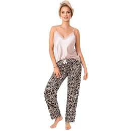 Stylowy i kobiecy komplet damski z delikatnej satyny to idealne połączenie elegancji, wygody i zmysłowego wyglądu. W zestawie znajduje się subtelna koszulka na cienkich, regulowanych ramiączkach oraz długie spodnie o luźnym kroju. Dekolt koszulki zdobi delikatna koronka, która dodaje całości romantycznego uroku. Długie satynowe spodnie z modnym, zwierzęcym printem gwarantują pełen komfort i swobodę ruchów, a w pasie ozdobione są uroczą kokardką. Komplet doskonale sprawdzi się jako piżama nocna lub stylowy homewear, zapewniając jednocześnie komfort i elegancki wygląd przez cały wieczór.