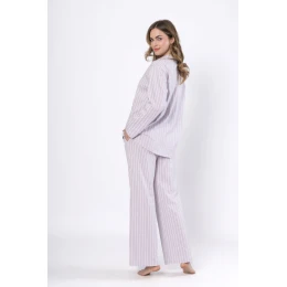 Dámské pyžamo LEVEZA JUDYTA 1613 je elegantní souprava na spaní, která kombinuje ženský styl s maximálním pohodlím. Je vyrobena ze 100% přírodní bavlny a zajišťuje prodyšnost a pohodlí po celou noc. horní díl je halenka s dlouhými rukávy a stojáčkem v jemné lila barvě se svislým proužkem. dlouhé kalhoty se širokými nohavicemi mají praktické kapsy a ozdobnou šňůrku v pase. ideální pro chladnější noci a domácí relaxaci. k dostání ve velikostech M–2XL.