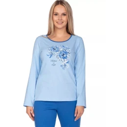 Dámské pyžamo 647 plus blue REGINA - vyrobené z velmi kvalitní bavlny - tričko světle modré barvy s dlouhými rukávy - na přední straně zdobené potiskem - dlouhé tmavě modré kalhoty - vhodné i na běžné denní nošení