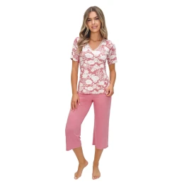 Piżama damska Tina 3/4 kr/r to elegancka i wygodna propozycja dla kobiet, które cenią sobie komfort snu połączony z kobiecym designem. Model wykonany został z wysokiej jakości wiskozy z dodatkiem elastanu, co zapewnia wyjątkową miękkość, przewiewność oraz idealne dopasowanie do sylwetki. Koszulka z krótkim rękawem ozdobiona subtelnym, kwiatowym printem prezentuje się niezwykle stylowo, a dekolt w kształcie litery V, wykończony delikatną ażurową koronką, dodaje całości elegancji i romantycznego charakteru. Do kompletu dołączone są jednolite spodnie o długości 3/4, które gwarantują swobodę ruchów i komfort noszenia zarówno podczas snu, jak i domowego relaksu. Piżama Tina 3/4 kr/r dosko: