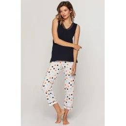 Top pyžama je ušitý z měkkého mikromodalu a kalhoty jsou vyrobené z ušlechtilé bavlny. Košilka bez rukávů má moderní prodloužený střih a na bocích rozparky. Výstřih je obšitý jemným tylem. Kalhoty v 7/8 délce zdobí měkký odolný potisk barevných puntíků. Manžety zdobí kontrastní lemovka.