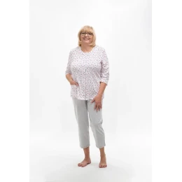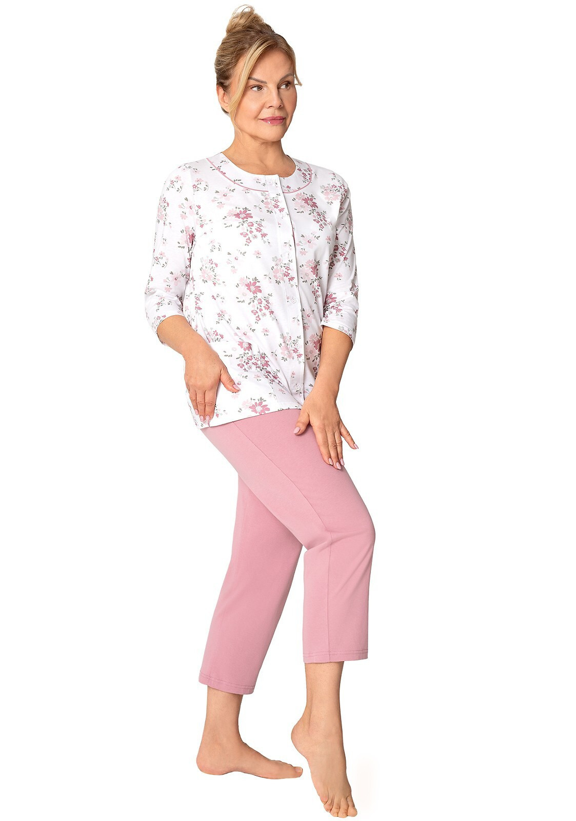 Blůza pyžama má 3/4 rukávy a je ozdobená květinovým vzorem. Půlkulatý výstřih se zapíná knoflíčky. Hladké kalhoty mají 3/4 délku. Střih a vzhled pyžama zachycují první tři fotografie.