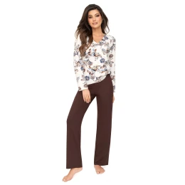 Dámske pyžamo Naomi long Donna - vyrobené z kvalitnej viskózy - krémové tričko s dlhým rukávom - výstrih do V - kvetinový vzor - dlhé hnedé nohavice