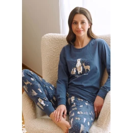 Dámske pyžamo PM.4340 J/25 je dokonalou kombináciou pohodlia, kvality a módneho dizajnu. Je vyrobené z mäkkej, 100 % bavlny a zaručuje pohodlný spánok počas celého roka. Hlavnú časť tvorí tričko s dlhými rukávmi, ktoré na prednej strane zdobí farebná potlač. Dlhé nohavice so zaujímavým vzorovaným dizajnom dodávajú súprave charakter. Elastické rebrované lemy na výstrihu, manžetách, spodnej časti trička a nohavíc zaručujú dokonalé prispôsobenie a pohodlné nosenie. Súprava je zabalená v atraktívnej škatuli - skvelý nápad na darček!