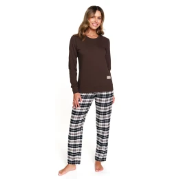 Dámske pyžamo PM.7333 značky Doctor Nap má klasický strih, ktorý spája pohodlie a nadčasový štýl. Je celé vyrobené z kvalitnej vzdušnej bavlny, je mäkké a príjemné na dotyk, čo zaručuje pohodlie pri spánku a domácom relaxe. Blúzka v hnedom odtieni má klasický výstrih a praktické rebrované manžety, ktoré jej dodávajú moderný nádych. Kárované nohavice vybavené funkčnými vreckami majú elastický pás a lem nohavíc pre pohodlné nosenie a zaručenú voľnosť pohybu.