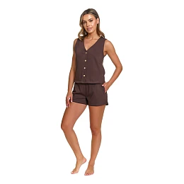 Blúzka s výstrihom do V jemne zvýrazňuje ženskú siluetu, zatiaľ čo ozdobné gombíky dodávajú štýlový nádych. Šortky majú pohodlný strih a vrecká, vďaka čomu je súprava nielen estetická, ale aj praktická.